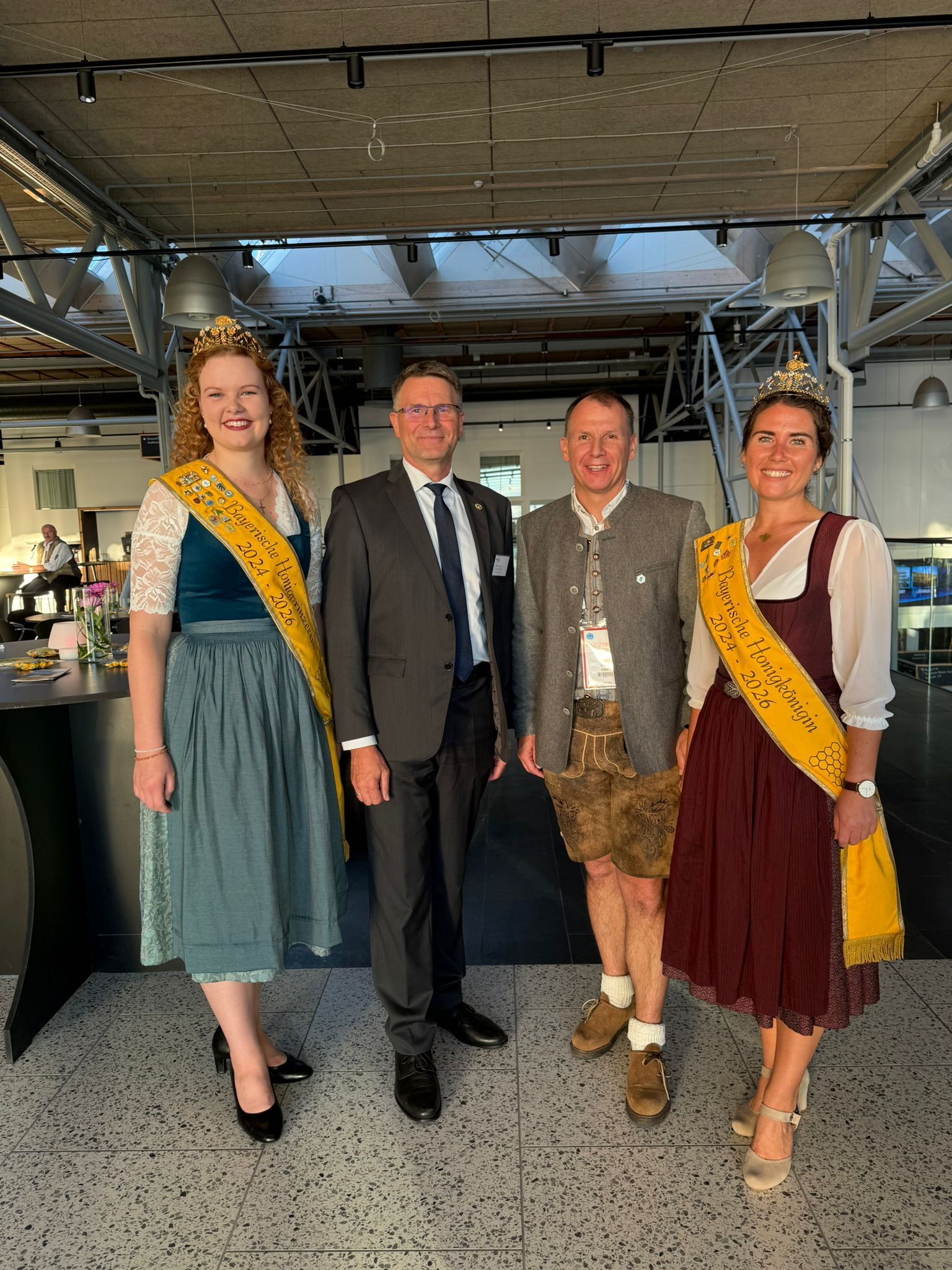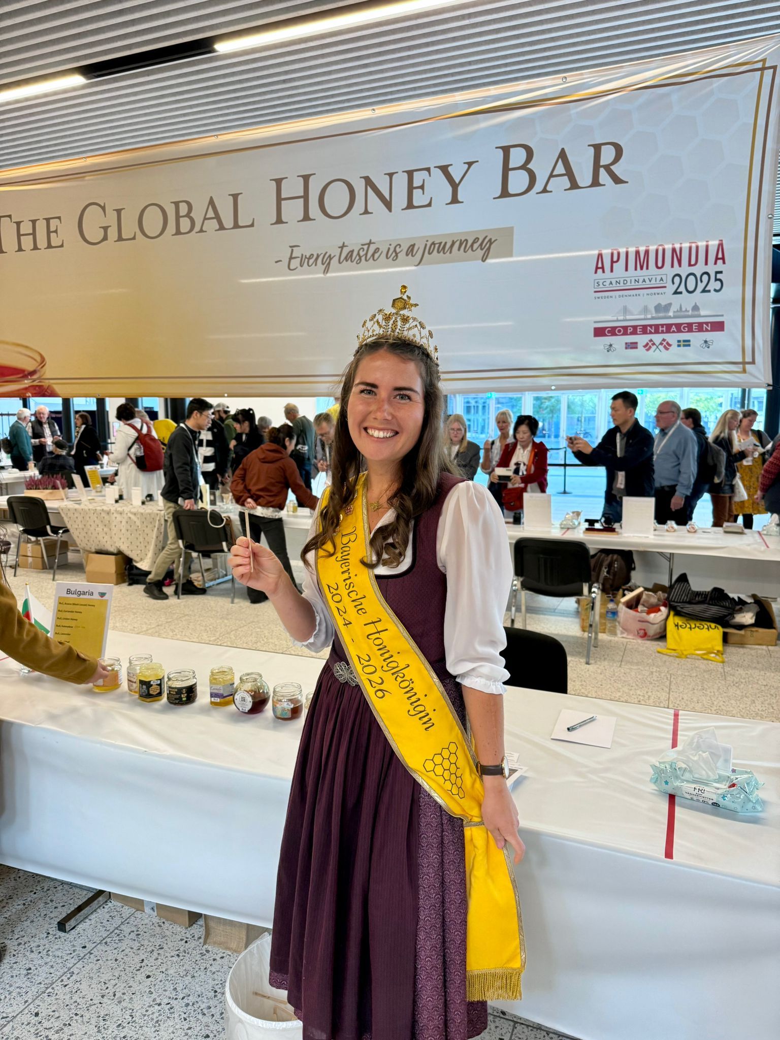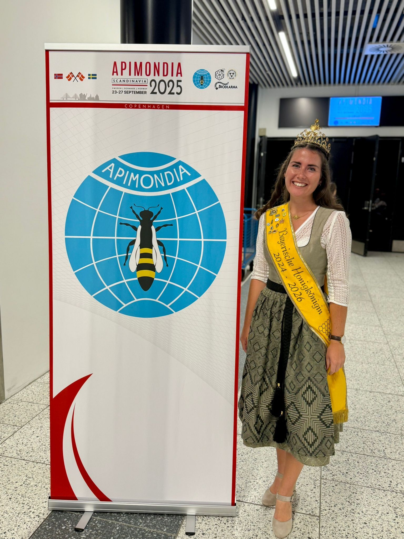 Ein ganz besonderes Highlight führte die Bayerische Honigkönigin Elena I. und die Bayerische Honigprinzessin Anja im Sommer 2025 nach Kopenhagen: Dort fand der Weltimkerkongress Apimondia statt – die weltweit größte Veranstaltung rund um Bienen, Imkerei und Honig. Tausende Teilnehmerinnen und Teilnehmer aus allen Teilen der Welt kamen zusammen, um sich über neueste wissenschaftliche Erkenntnisse, innovative Projekte und die Bedeutung der Bienen für Natur und Gesellschaft auszutauschen. Die beiden Bayerischen Hoheiten vertraten den Deutschen Imkerbund (D.I.B.) am Messestand und waren dort ein wahrer Blickfang. Mit großem Fachwissen, Herzlichkeit und spürbarer Begeisterung standen sie den internationalen Gästen Rede und Antwort. Viele Besucherinnen und Besucher nutzten die Gelegenheit, sich über die bayerische Imkerei, die Honigtradition und die Arbeit des DIB zu informieren. Dabei entstanden nicht nur interessante Gespräche, sondern auch neue Kontakte über Ländergrenzen hinweg.