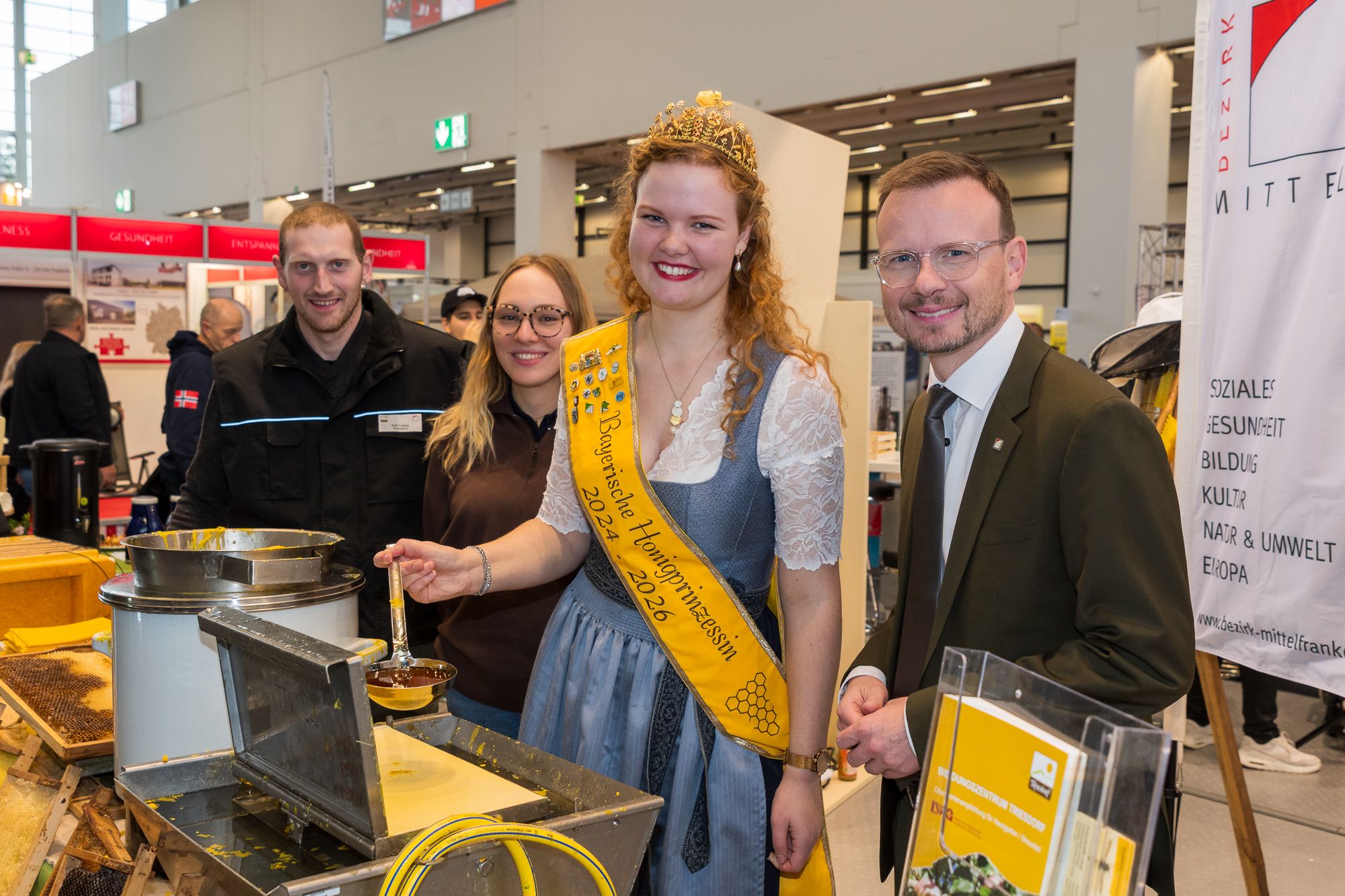 Die Bayerische Honigprinzessin Anja Bürzer zusammen Wolfgang Fischer und Anna von der Imkerei Schaller (v.l.).