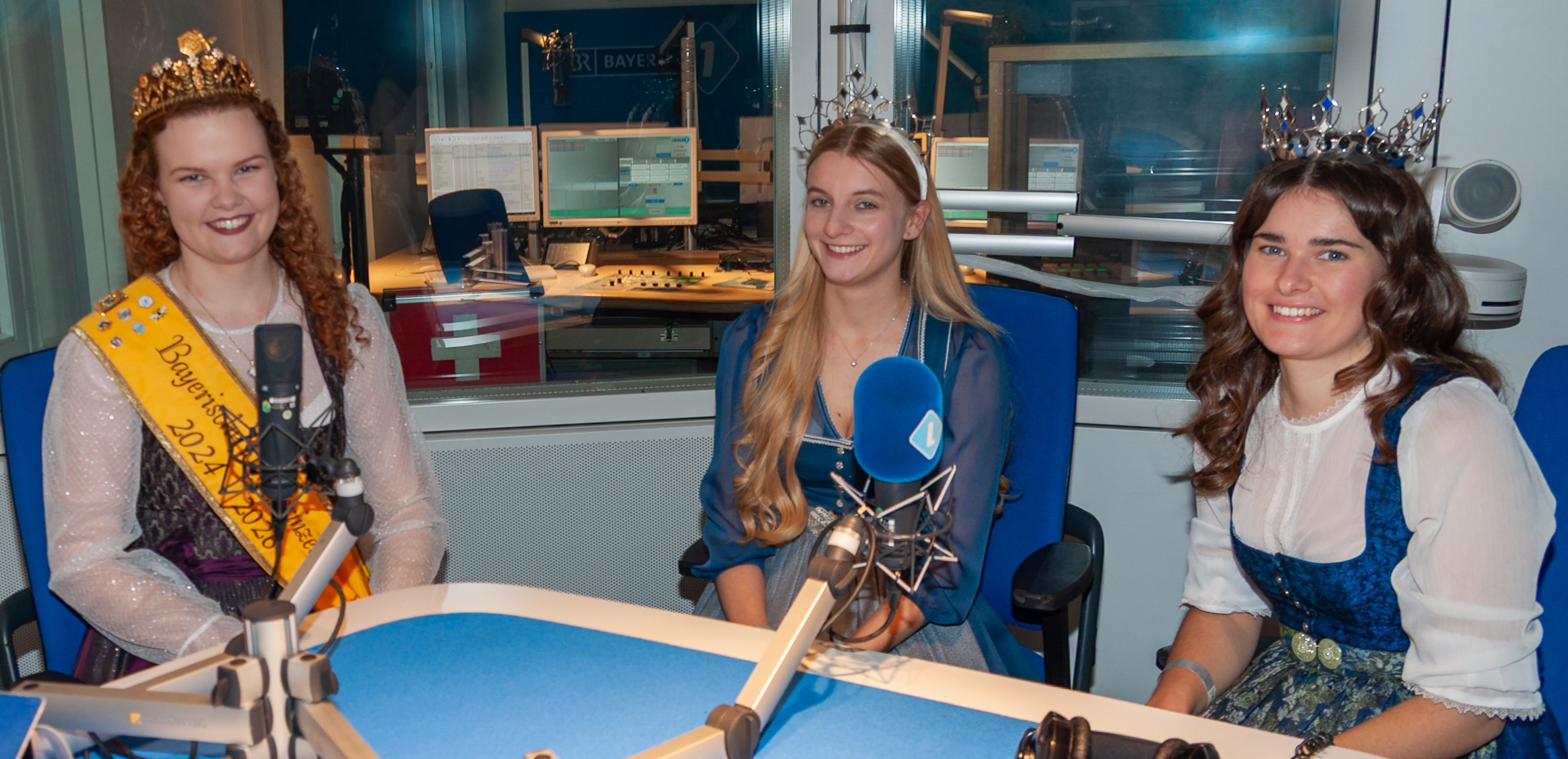 Die Bayerische Honigprinzessin Anja Bürzer zusammen mit der Bayerischen Milchprinzessin Verena Wagner und der Bayerischen Milchkönigin Elisabeth Heimerl im Hörfunk-Studio von Bayern1 (l.), sowie nach dem Einsatz am Spendentelefon zusammen mit "daoahm is dahoam"-Schauspieler Philipp Schneider (m.). Auch die langjährige Moderatorin der Sternstundengala, Sabine Sauer, traf Anja in der Spendenzentrale an (r.).