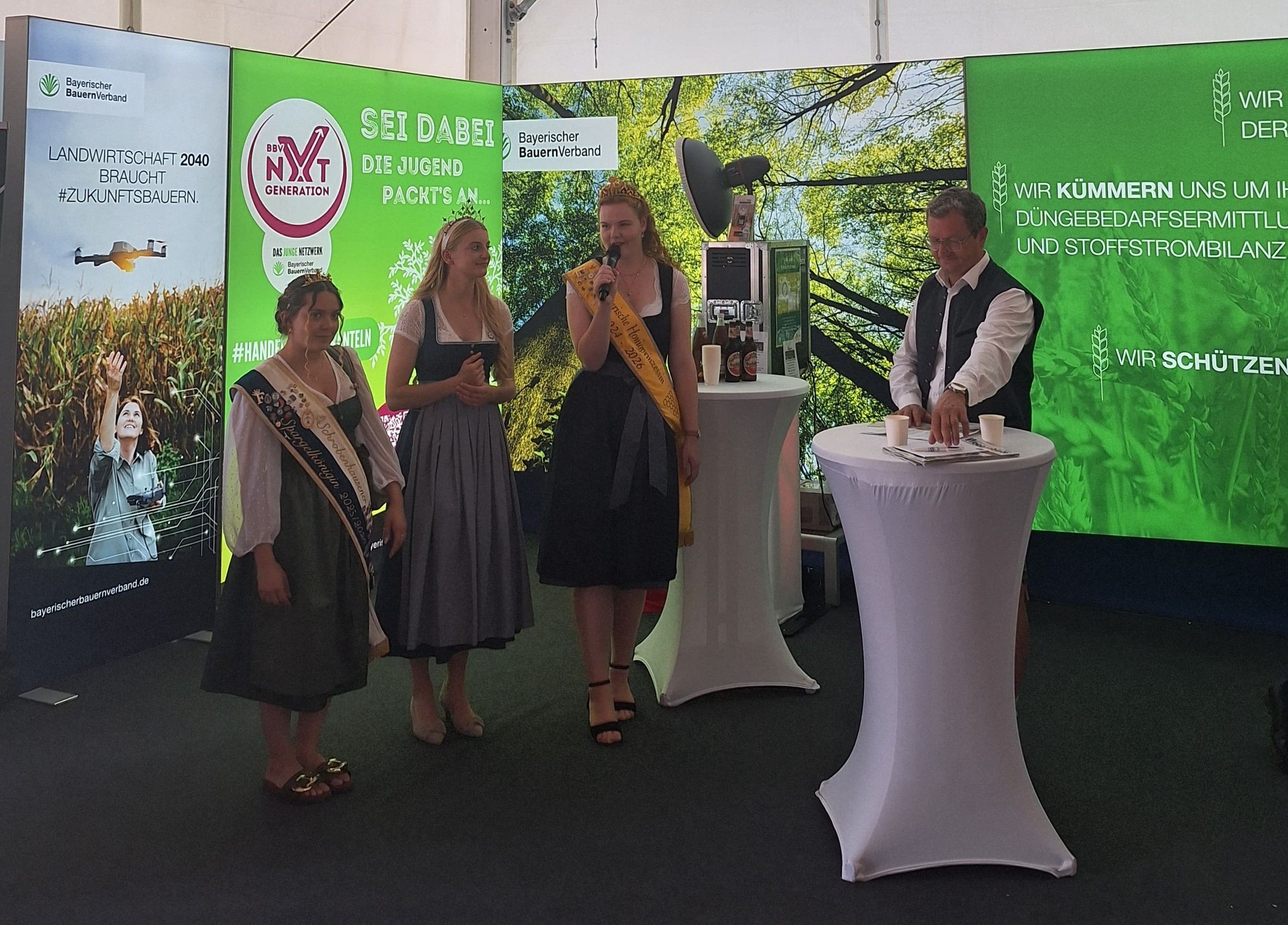 Das Team am deutschen Stand auf der Apimondia ist bereit - unterstützt von der Bayerischen Honigprinzessin Anja (l.) und der Bayerischen Honigkönigin Elena I. (r.)