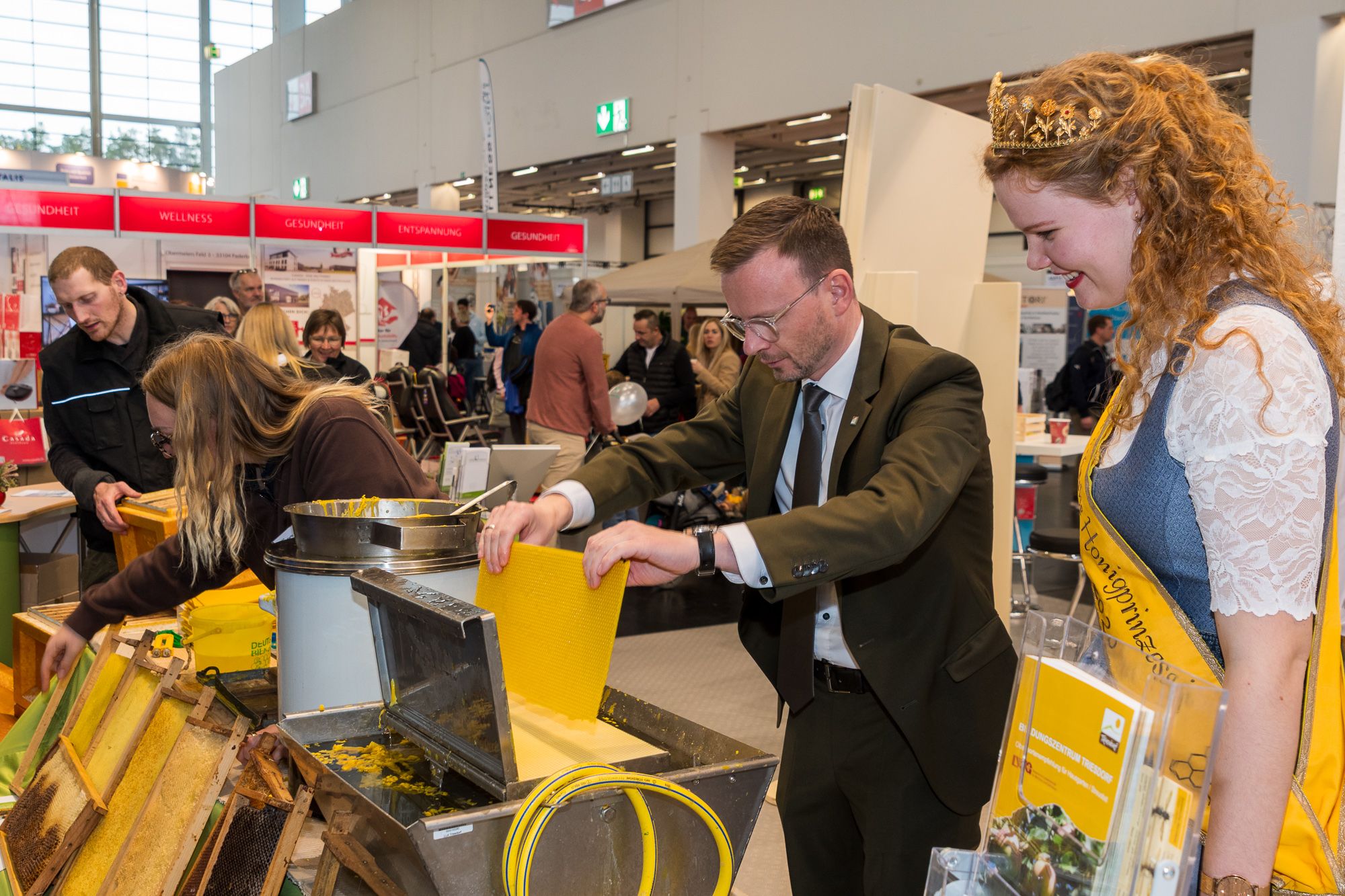 Am Stand der Landwirtschaftlichen Lehranstalten Triesdorf konnten Bienen und verschiedene weitere Präparate unter dem Mikroskop betrachtet werden, und es wurden Mittelwände gegossen. Gerne probierte auch die Bayerische Honigprinzessin Anja die wassergekühlte Mittelwandgußform aus und zeigte das Mittelwandgießen den Besuchern. Der mittelfränkische Bezirkstagspräsident Daniel Forster ließ es sich im Anschluss an den offiziellen Rundgang nicht nehmen, auch selbst eine Mittelwand zu gießen, unterstützt von der Bayerischen Honigprinzessin. Besonders die Kinder waren mit Feuereifer beim Mittelwandgießen dabei und durften sich auch unter Anleitung selbst probieren. Anlässlich des Jubiläums „20 Jahre Metropolregion Nürnberg“ endete der Rundgang bei „Original Regional“, wo regionale Erzeuger aus der Region ihre Produkte feilboten. Die Metropoolregion Nürnberg bewirbt sich um das „Welterbe Agrarkultur“, die Bewerbung war im Rahmen der Eröffnungsveranstaltung Thema der Podiumsdiskussion unter dem Motto „Zwischen Feld und Wald“.