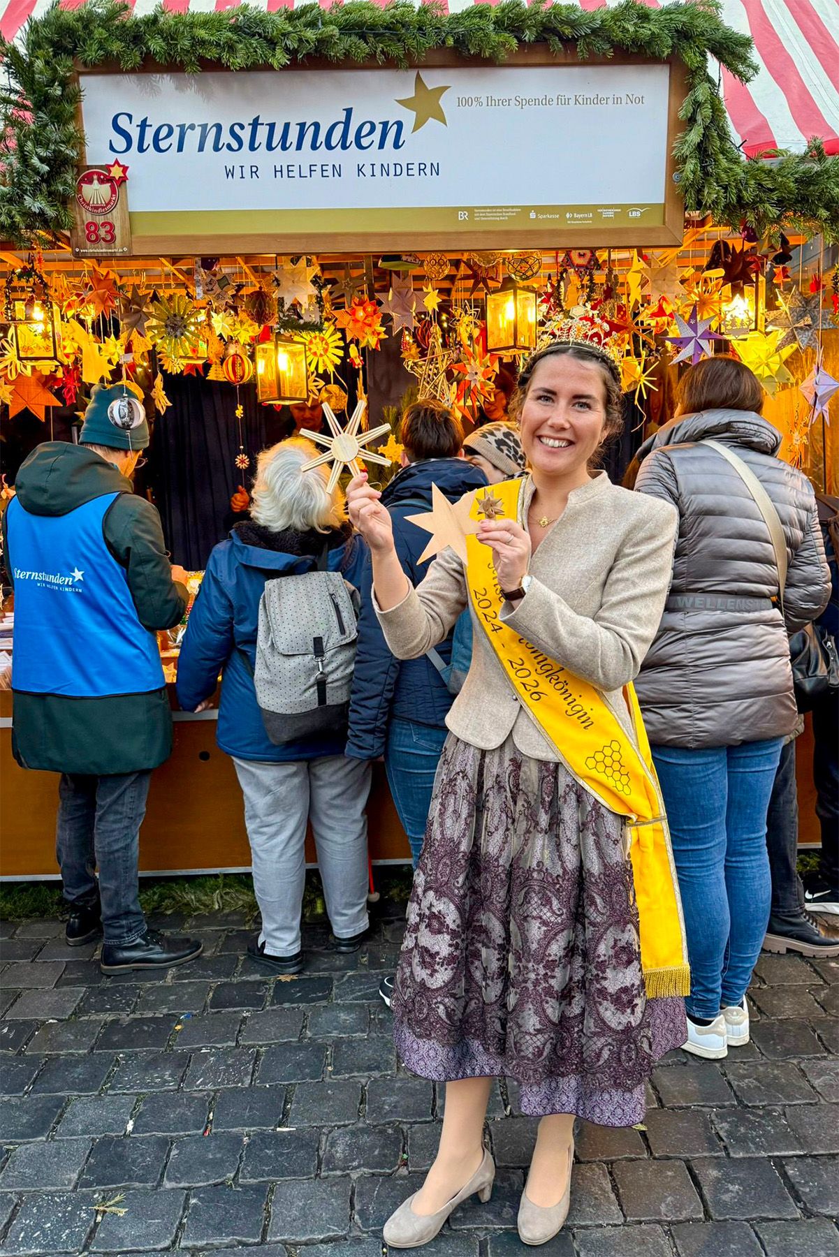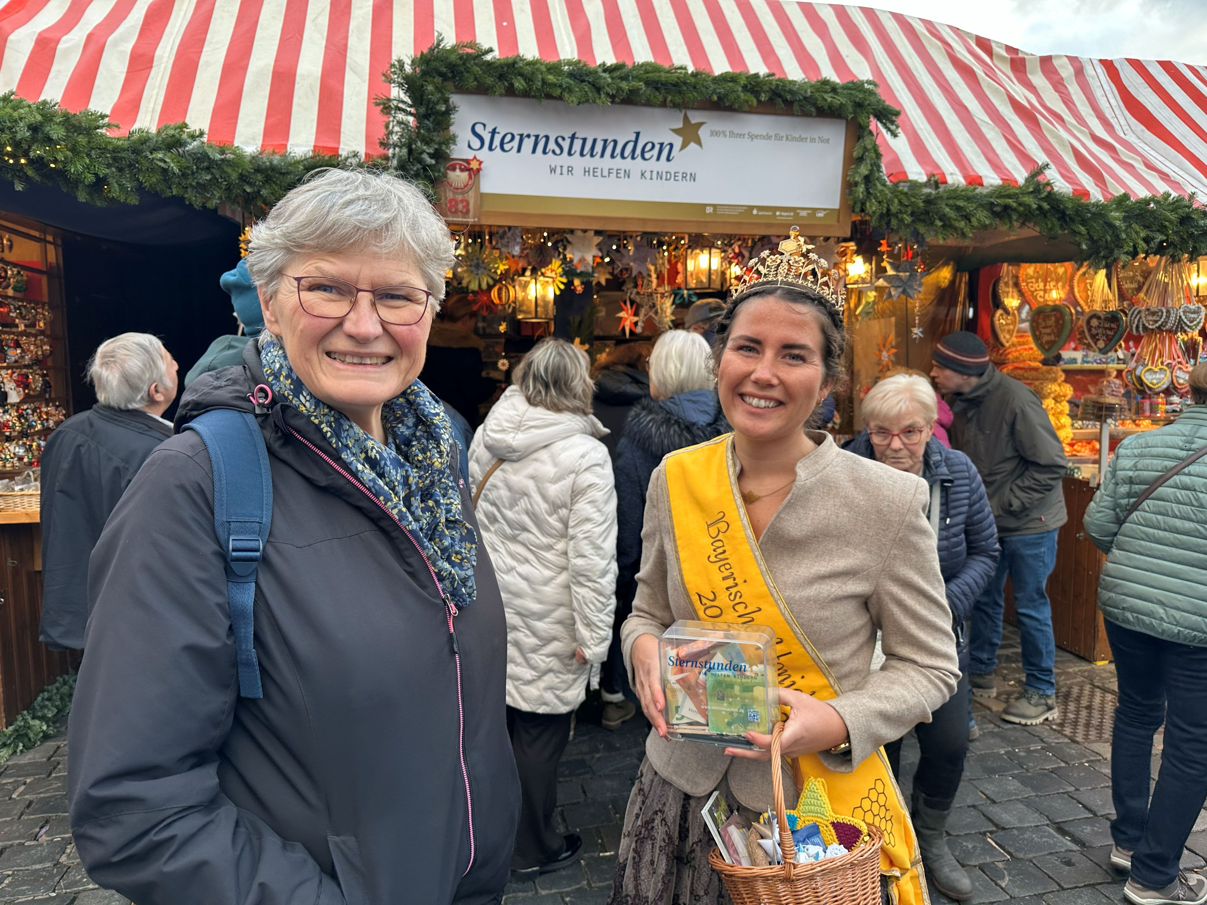 Anfang Dezember engagierte sich die Bayerische Honigkönigin Elena I. am Sternstunden-Stand auf dem Nürnberger Christkindlesmarkt. Auf dem festlich geschmückten Hauptmarkt unterstützte sie die Benefizaktion von Sternstunden e. V., die sich seit vielen Jahren für hilfsbedürftige Kinder einsetzt. Eine Stunde lang stand Elena I. am Sternstundenstand und sammelte Spenden: In einem Körbchen befanden sich liebevoll gebastelte Sterne, die von den Besucherinnen und Besuchern gegen eine Spende ausgewählt werden konnten. Die große Spendenbereitschaft der Marktgäste war beeindruckend – in nur einer Stunde kamen sensationelle 597,50 Euro in der Spendendose von Elena I. zusammen. Viele Besucher nutzten dabei die Gelegenheit, einen Stern mitzunehmen, ins Gespräch zu kommen und gleichzeitig Gutes zu tun. Auch darüber hinaus war Elena I. auf dem Christkindlesmarkt unterwegs. Beim Rundgang über den Markt kam es zu zahlreichen Begegnungen, Gesprächen und Fotos mit Besucherinnen und Besuchern. Besonders der Austausch mit regionalen Direktvermarktern aus der Metropolregion Nürnberg und mit Imkern unterstrich die enge Verbindung von Ehrenamt, Regionalität und sozialem Engagement.