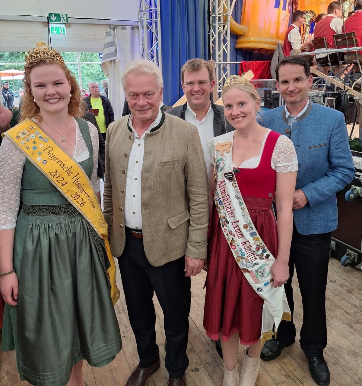 Die Bayerische Honigprinzessin Anja zusammen mit Richard Mittl, Bürgermeister von Mörnsheim, und der Altmühltaler Lammkönigin Annemarie Mack (l.), sowie (r.) mit der Bayerischen Wollkönigin Janine Staudacher und der Altmühltaler Lammkönigin Annemarie.