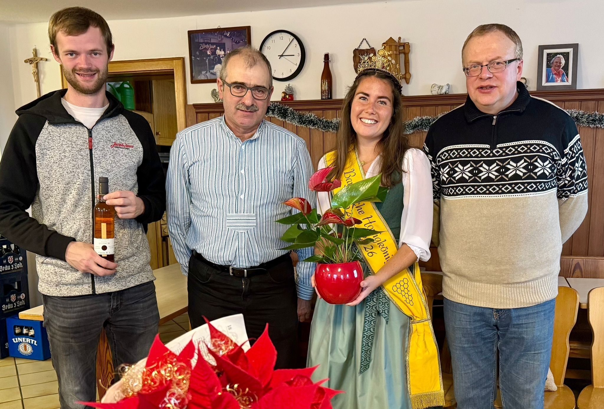 Georg Wimmer (KV Mühldorf-Altötting), Markus Eberl (1. Vorsitzender BZV Haager Land), die Bayerische Honigkönigin Elena Eberl und Peter Schneider (2. Vorsitzender BZV Haager Land) freuten sich über die gelungene Adventsfeier des Bienenzuchtvereins Haager Land (v.l.n.r.).
