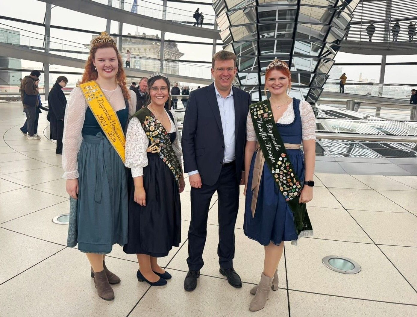 Auf der Kuppel des Reichstagsgebäudes: die Bayerische Honigprinzessin Anja Bürzer, die ehemalige Jura-Vize-Hopfenkönigin Linda Gottsmich und die ehemalige Bayerische Kartoffelkönigin Daniela Dreher (v.l.) mit MdB Dr. Reinhard Brandl (2.v.r.).