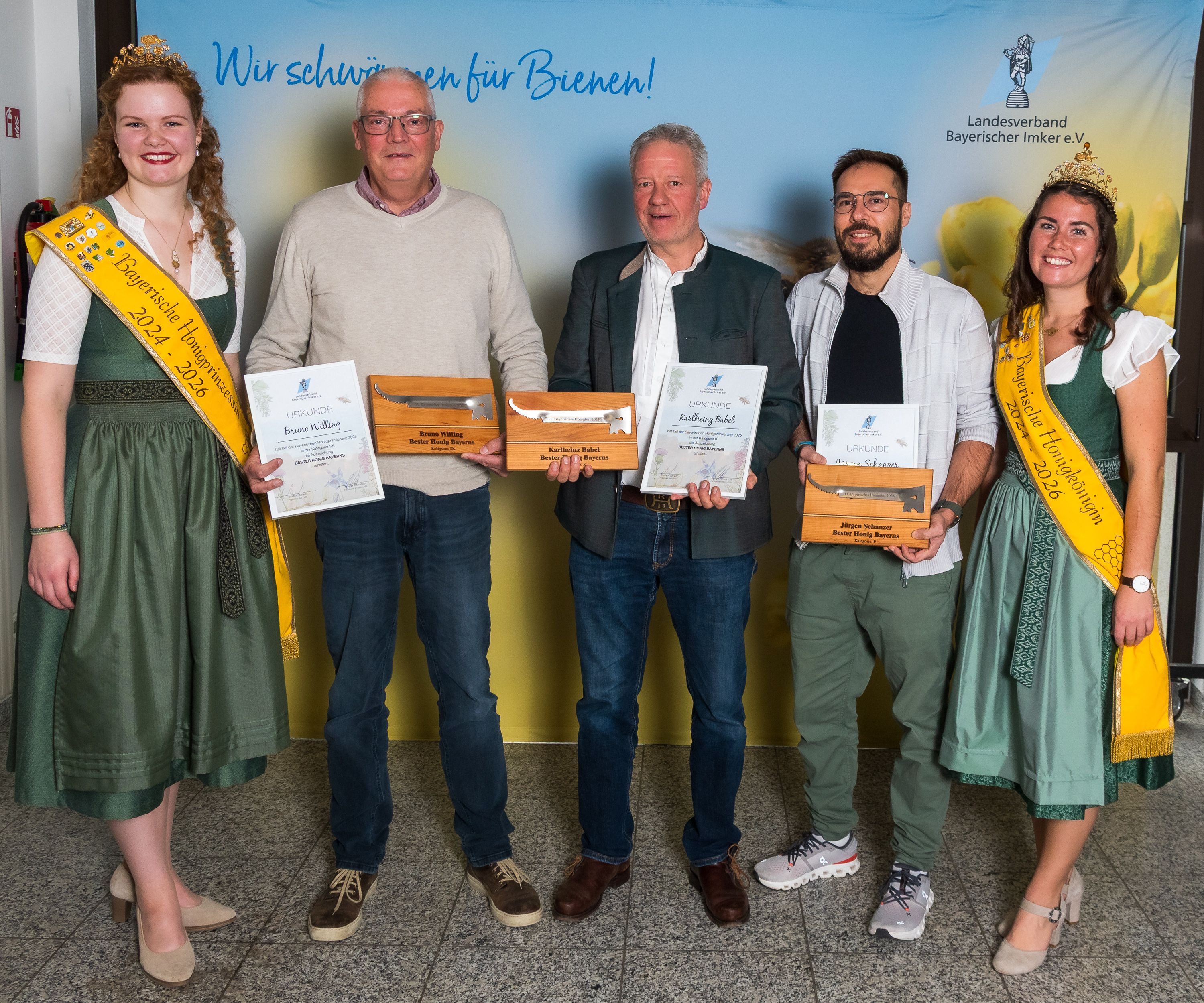 Die Bayerische Honigkönigin Elena I. (r.) und die Bayerische Honigprinzessin Anja (l.) überreichten die Auszeichnungen für den besten Honig Bayerns an (v.l.): Bruno Willing (Oberbayern, Kategorie "Sommertracht kristallisiert"), Karlheinz Babel (Schwaben, Kategorie "Frühtracht kristallisiert") und Jürgen Schanzer (Niederbayern, Kategorie "Flüssig").