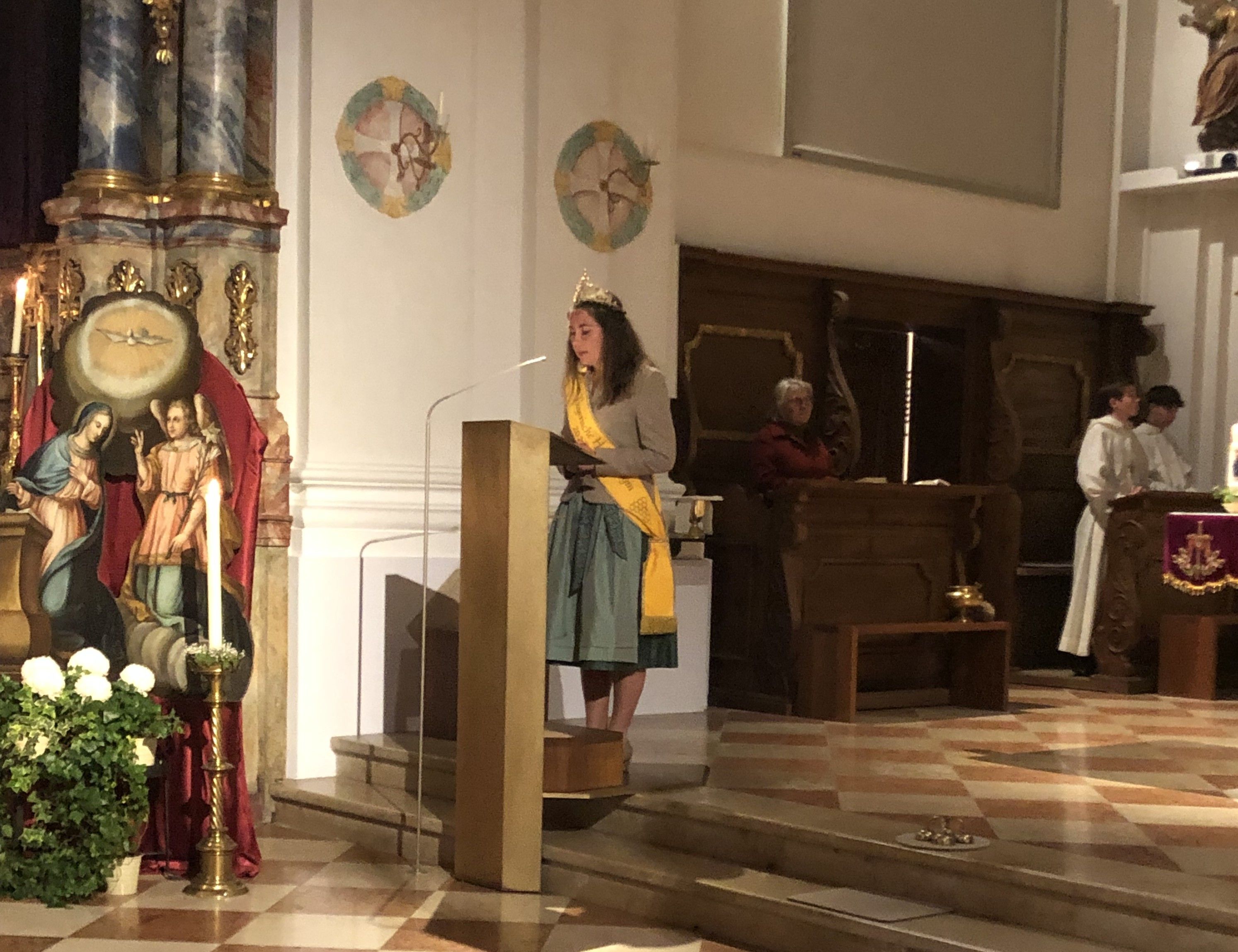 Die Fürbitten wurden von Elena I. vorgetragen (u.l., Foto Ch. Schlemer) - der 1. Vorsitzende Christian Schlemer und Elena I. freuten sich über die zahlreichen mitgebrachten Ambrosiusfiguren und Honiggläser (u.r.). Zum Abschluß durfte sich Elena I. mit einer Widmung in der Vereinschronik verewigen (o.r.).