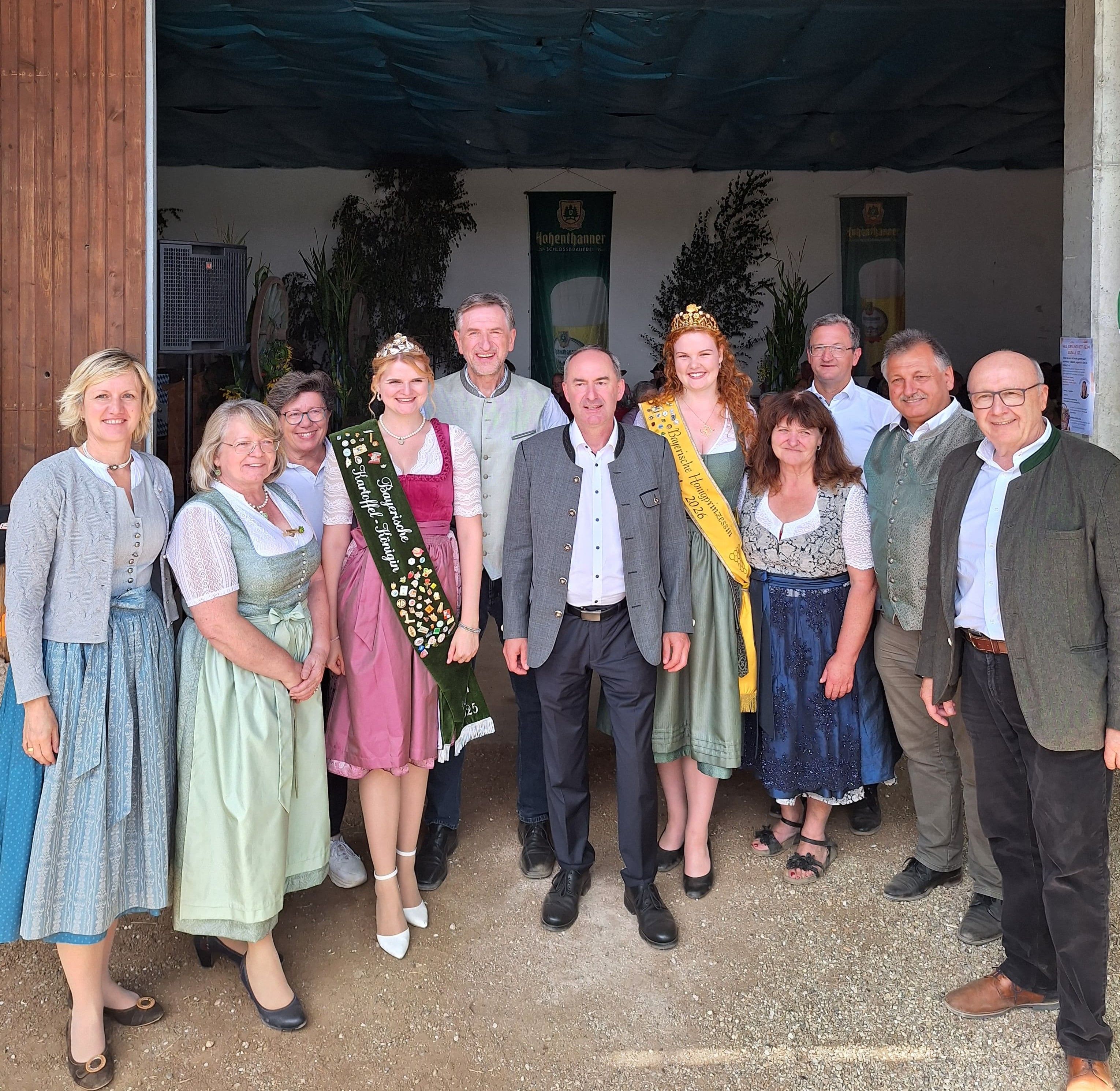 Die Ehrengäste beim Hoffest: MdL Petra Högl (leitende Vorsitzende Agrarausschuß), Kreisbäuerin Rita Schultes, Bezirksrätin Hannelore Langwieser, die Bayerische Vize-Kartoffelkönigin Daniela Dreher BBV-Präsident Günther Felßner, der stv. Bayerische Ministerpräsident Hubert Aiwanger, die Bayerische Honigprinzessin Anja Bürzer, Gastgeberin Angelika Wimmer, BBV-Bezirkspräsident Siegfried Jäger, BBV-Kreisobmann Georg Sachsenhauser und der Kelheimer Landrat Martin Neumayer (v.l.).