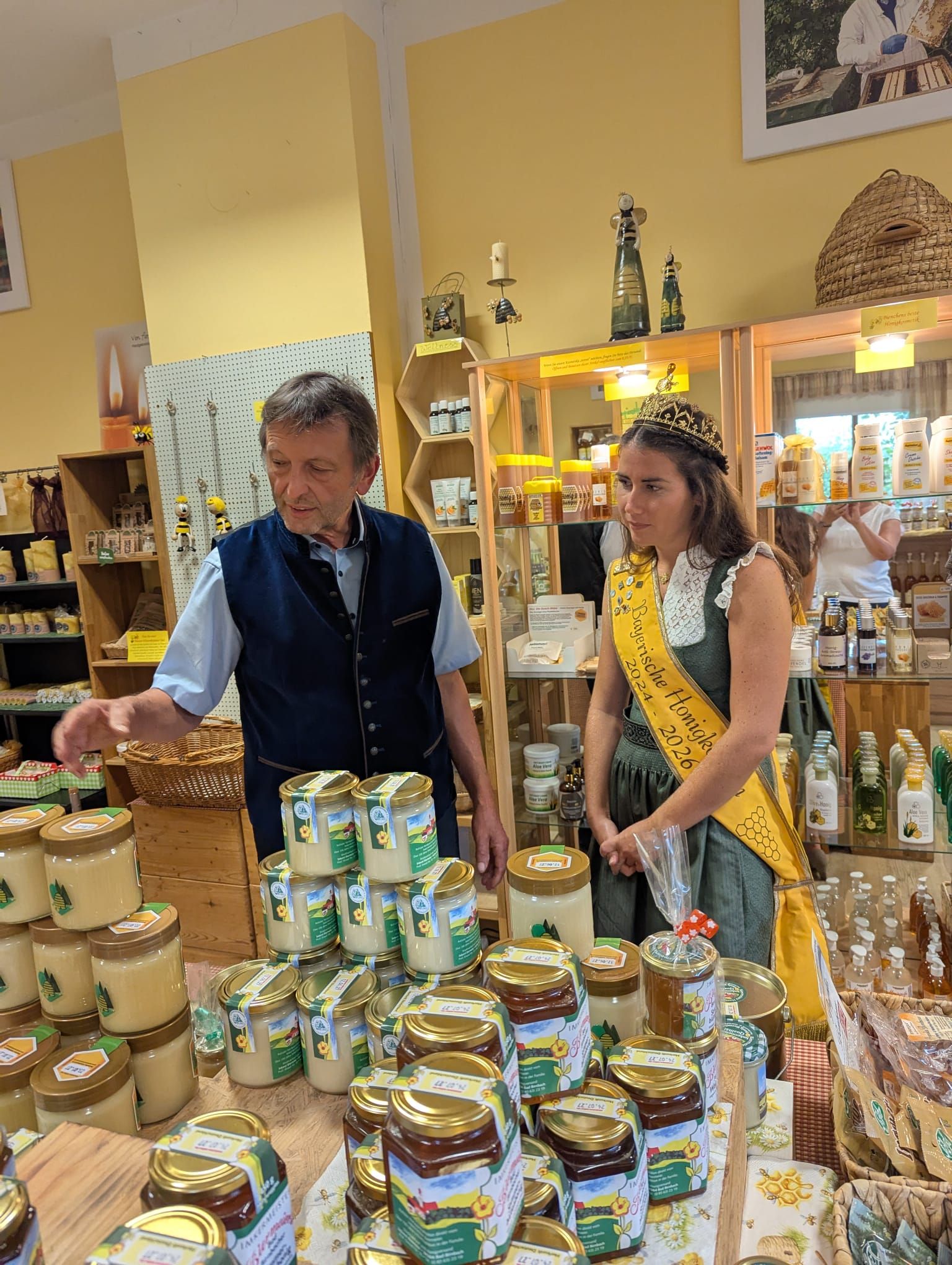 Imkermeister Siegfried Biermeier sowie Roswitha Klingshirn begrüßen die Bayerische Honigkönigin Elena Eberl in ihrem Honigladen (Foto l.), und Siegfried Biermeier ließ es sich nicht nehmen, Elena I. seine Honige vorzustellen. Als Spezialität hat er anläßlich des Jubiläums "100 Jahre Echter Deutscher Honig" auch Honig im Jubiläumsglas aus dem Jahr 2000 im Sortiment (Foto rechts - Fotos: Imkerei Biermeier).