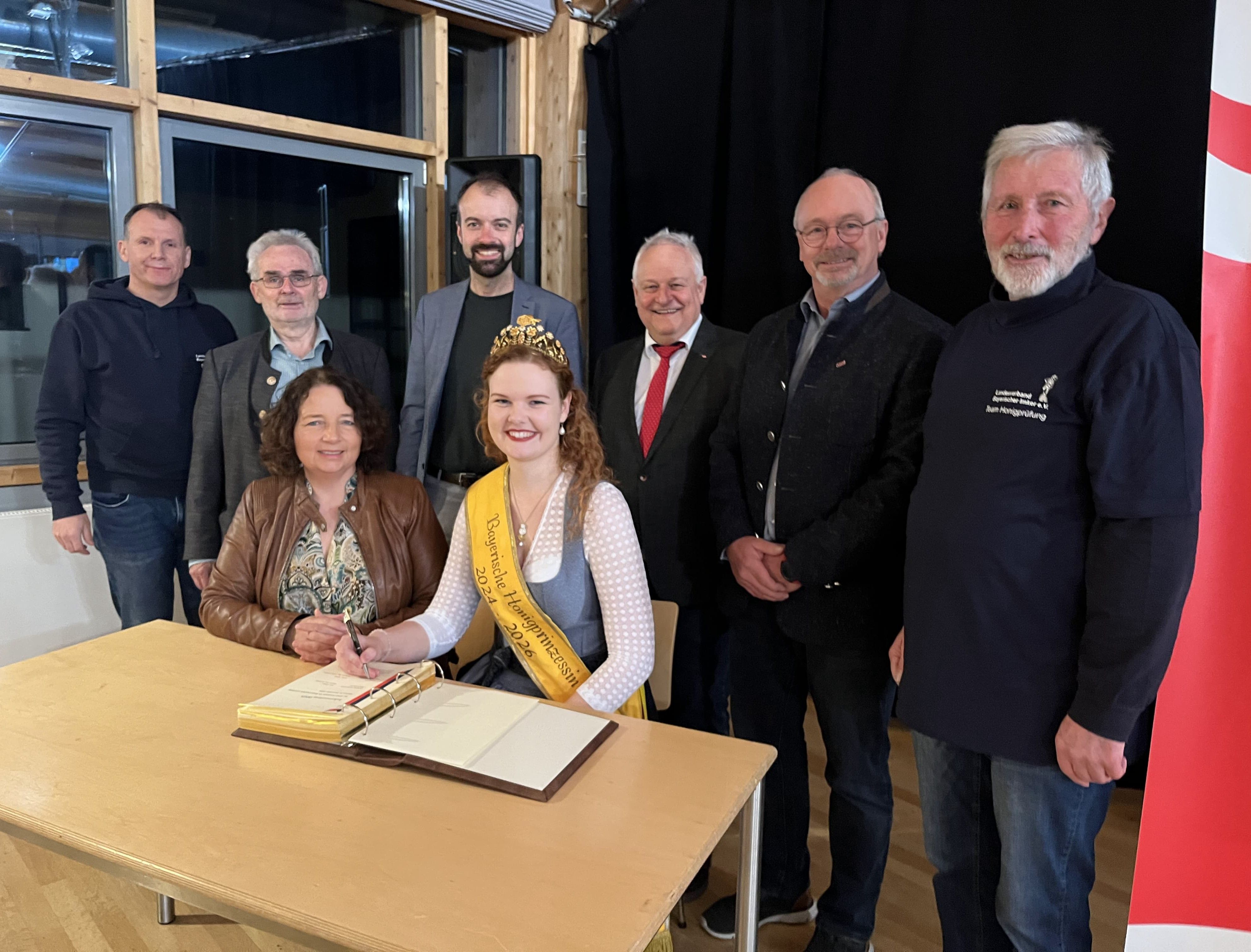 Beim Eintrag ins Goldene Buch (Foto l.): MdL Ruth Müller und die Bayerische Honigprinzessin Anja Bürzer (sitzend), sowie LVBI-Präsident Stefan Spiegl, Hans Seidl, Bürgermeister Sebastian Stanglmeier, der SPD-Ortsvorsitzende Hans Wagner, der Leiter des IBI Veitshöchheim Dr. Stefan Berg und der Kreisvorsitzender der Imker Albert Maier (stehend, v.l.).