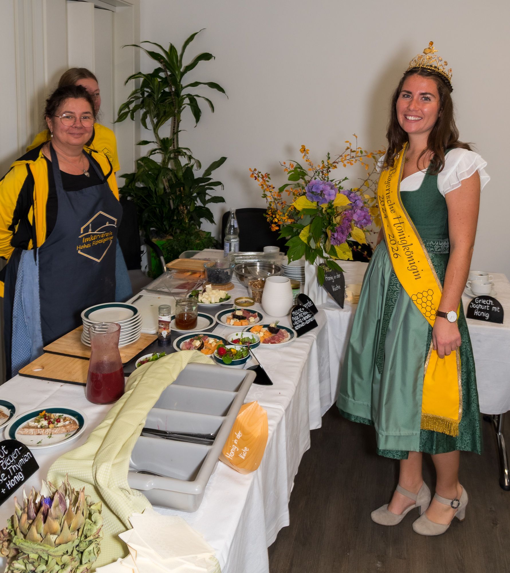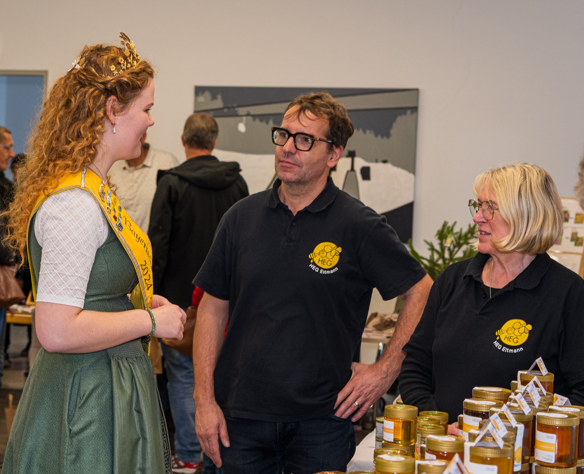 Nach der Preisverleihung nutzten die beiden Hoheiten die Gelegenheit, sich die Ausstellungsstände anzusehen, Autogrammkarten zu verteilen und mit den Besucherinnen und Besuchern ins Gespräch zu kommen. Das Honigfest in Bischofsgrün bot damit erneut eine perfekte Mischung aus Wettbewerb, Fachinformation und Begegnung – und zeigte eindrucksvoll, wie lebendig die Imkerei in Bayern ist. „Ein herzliches Dankeschön allen, die mit Engagement und Liebe zum Detail den besonderen Tag heute organisiert und möglich gemacht haben – sie alle tragen dazu bei, daß das Bayerische Honigfest zu einem Ort der Begegnung und des Genusses wird.“ dankte Anja – und Elena I. ergänzte: „Wer Bayerischen Honig kauft und genießt, unterstützt nicht nur die handwerkliche Qualität, sondern auch unsere Kulturlandschaft und die lange, lebendige Tradition.“ Für Elena I. und Anja war es ein Tag voller persönlicher Begegnungen, Gespräche und wertvoller Impulse für die Förderung der heimischen Bienen und ihrer Produkte.