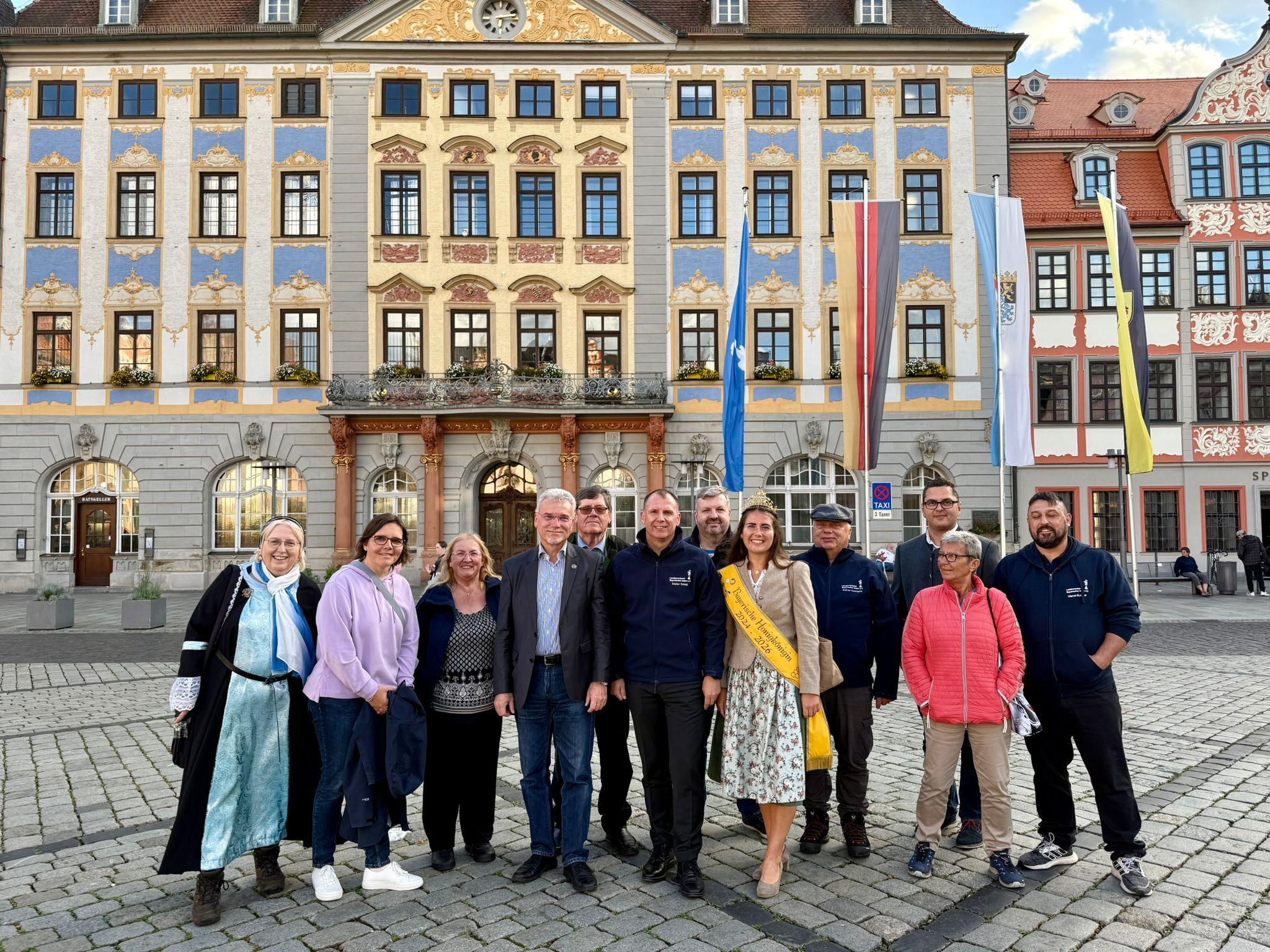 Im Rahmen des Bayerischen Imkertags, der in Coburg stattfand, wurde die Bayerische Honigkönigin Elena I. bereits am Freitag herzlich in der Stadt empfangen. Gemeinsam mit Mitgliedern des Präsidiums des Landesverbands Bayerischer Imker folgte sie der Einladung des Oberbürgermeisters ins Rathaus am Coburger Marktplatz. Der Empfang bot Gelegenheit zu einem persönlichen Kennenlernen und unterstrich die Wertschätzung, die der Imkerei in der Region entgegengebracht wird. Im Anschluss daran stand eine Stadtführung auf dem Programm, bei der die Gäste die historische Altstadt und die besonderen Sehenswürdigkeiten Coburgs kennenlernen durften. Der Tag fand seinen Ausklang bei einem gemeinsamen Abendessen mit den Imkerinnen und Imkern aus Coburg – eine schöne Gelegenheit für Austausch, Vernetzung und angeregte Gespräche in geselliger Atmosphäre. Der Auftakt zum Bayerischen Imkertag machte damit bereits im Vorfeld deutlich, wie stark die Verbundenheit zwischen Gastgeberstadt, Imkerschaft und den bayerischen Honighoheiten ist.