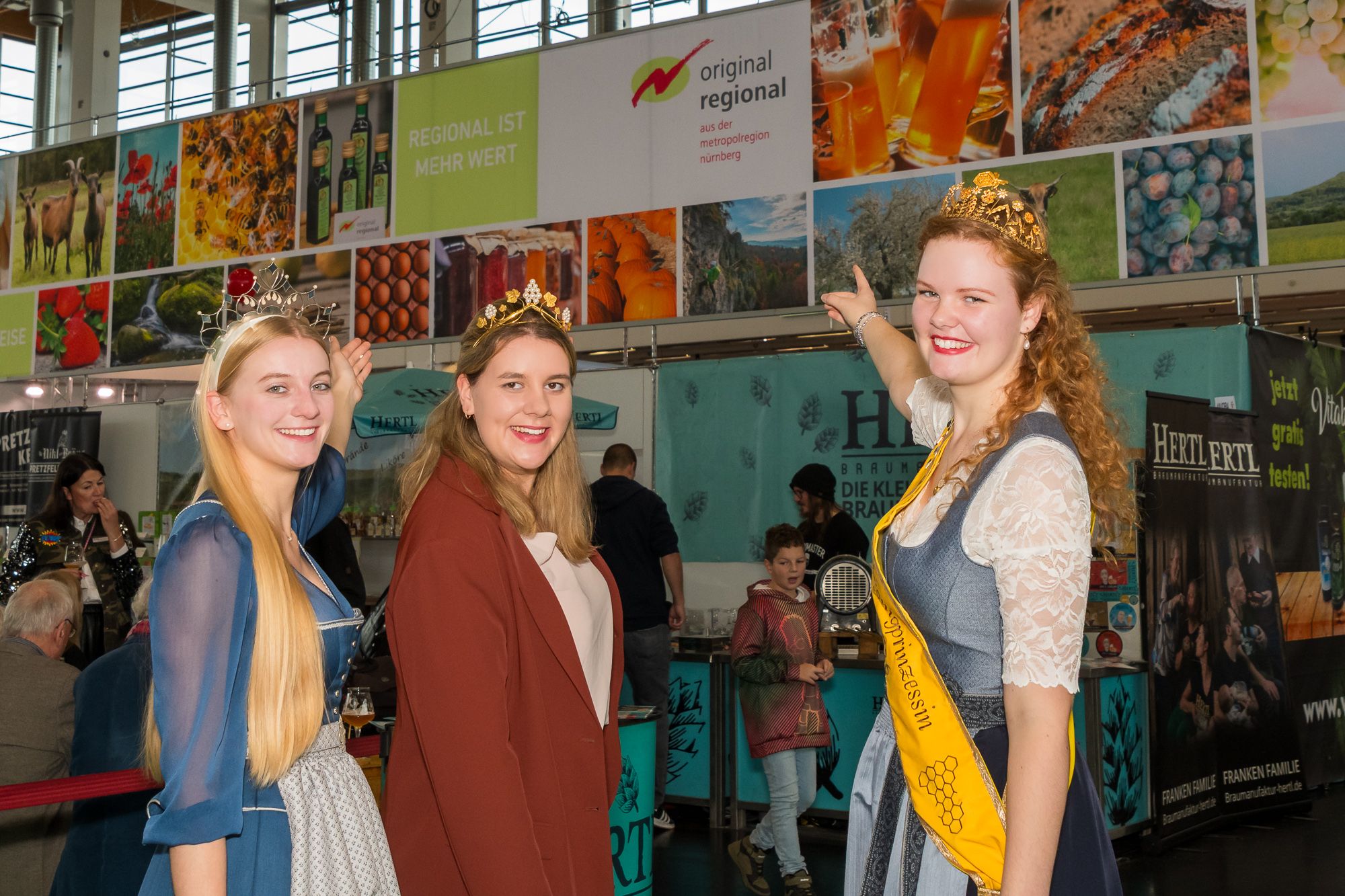 Die Bayerische Honigprinzessin Anja beim Besuch am Stand der Imkerei Segerer (linkes Bild) und am Stand von "Geprüfte Qualität Bayern" mit Elisabeth Berghammer und Annika Nattensteiner (rechtes Bild, v.l.).