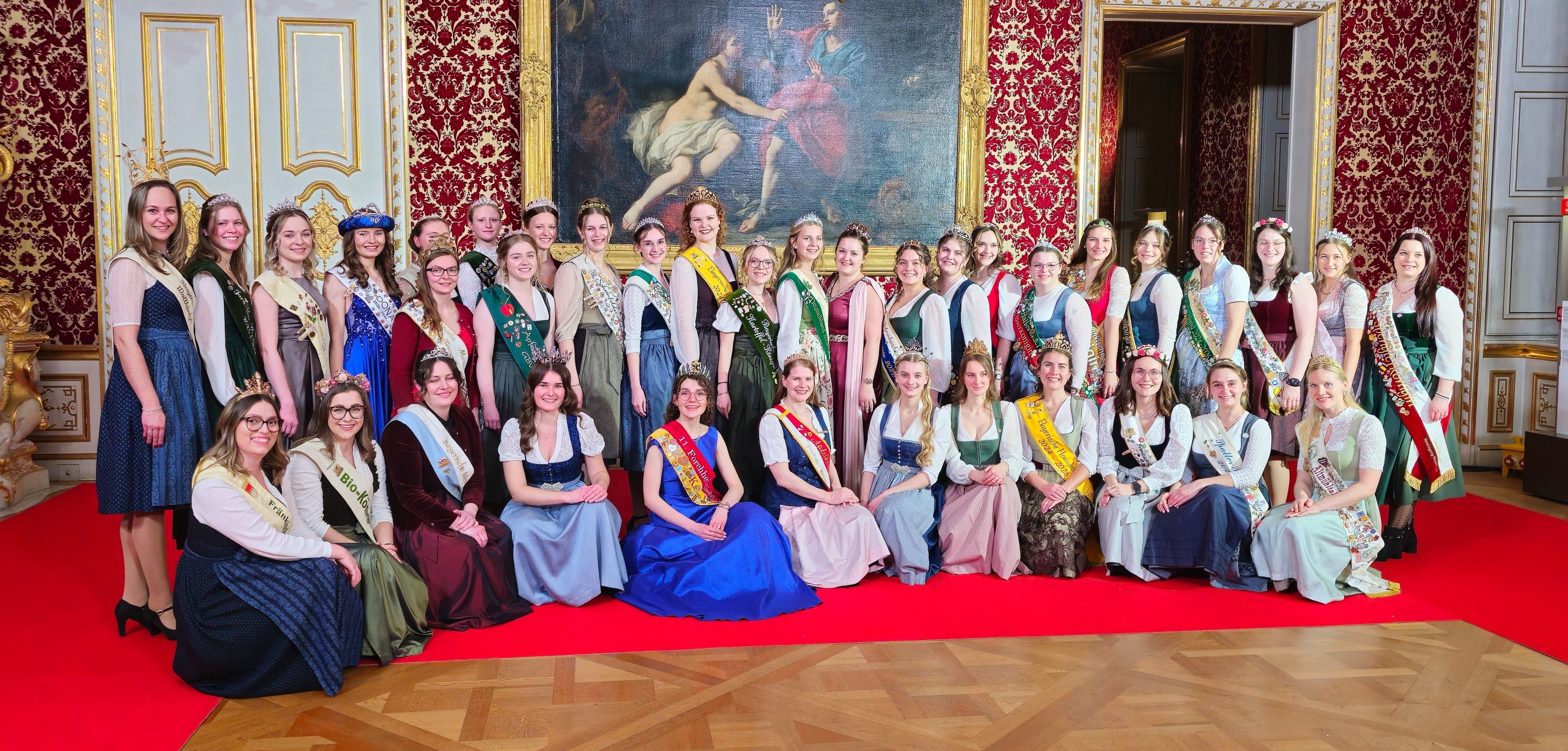 Die Bayerische Honigkönigin Elena I. (vordere Reihe, 4.v.r.) und die Bayerische Honigprinzessin Anja (hintere Reihe, 14.v.r.) zusammen mit den geladenen Hoheiten Bayerns - diesmal ohne Ministerpräsident Söder, der in diesem Jahr auf das Defilée aus gesundheitlichen Gründen verzichten mußte.
