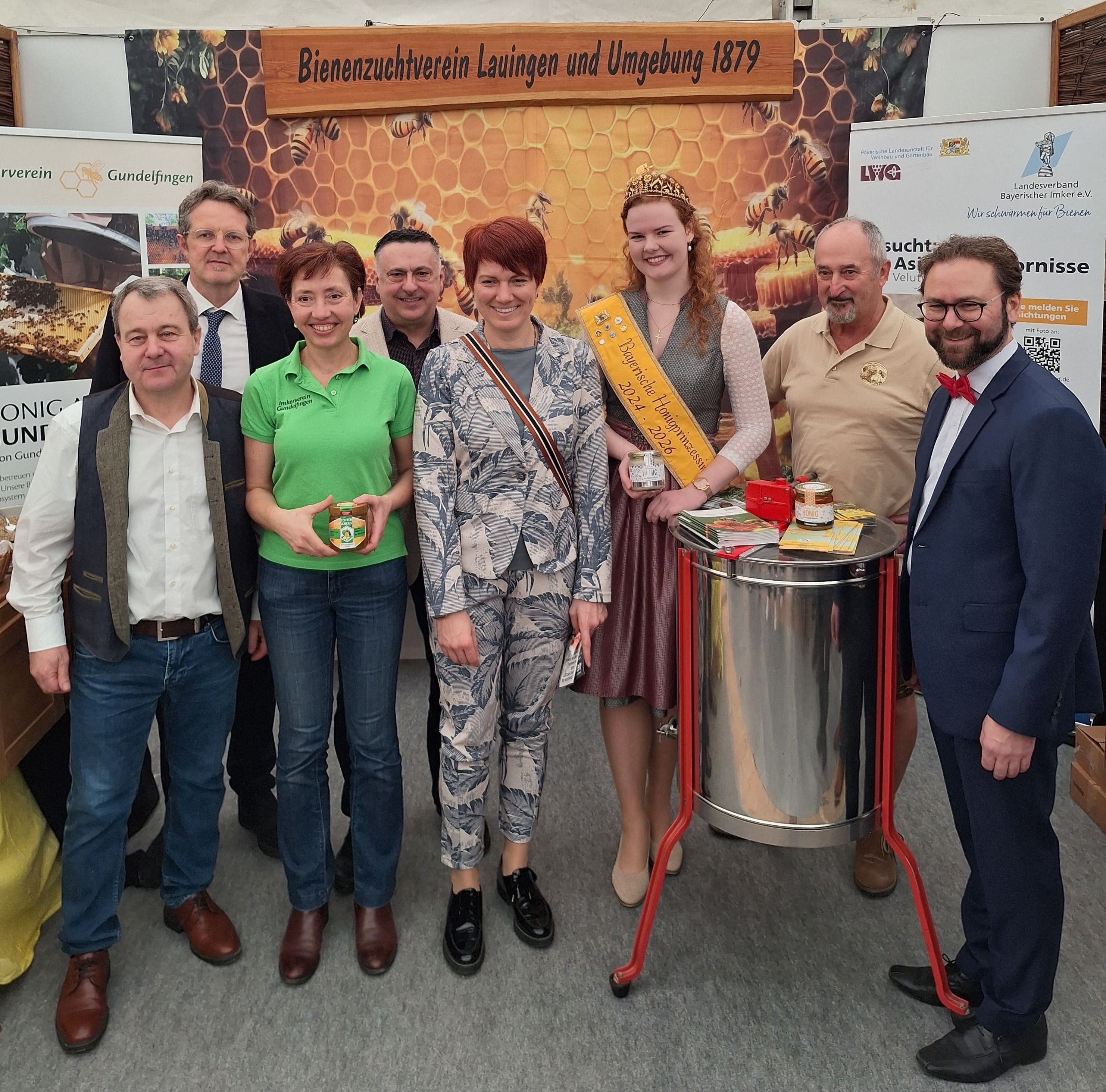 Der Vorsitzende des Imkervereins Lauingen und Umgebung, Bernhard Wörner (l.), freute sich sehr, zusammen mit seinem Team und der Bayerischen Honigprinzessin Anja (3.v.r.) die Ehrengäste am Imkerstand zu begrüßen, darunter die Bürgermeisterin von Lauingen, Katja Müller (4.v.r.).