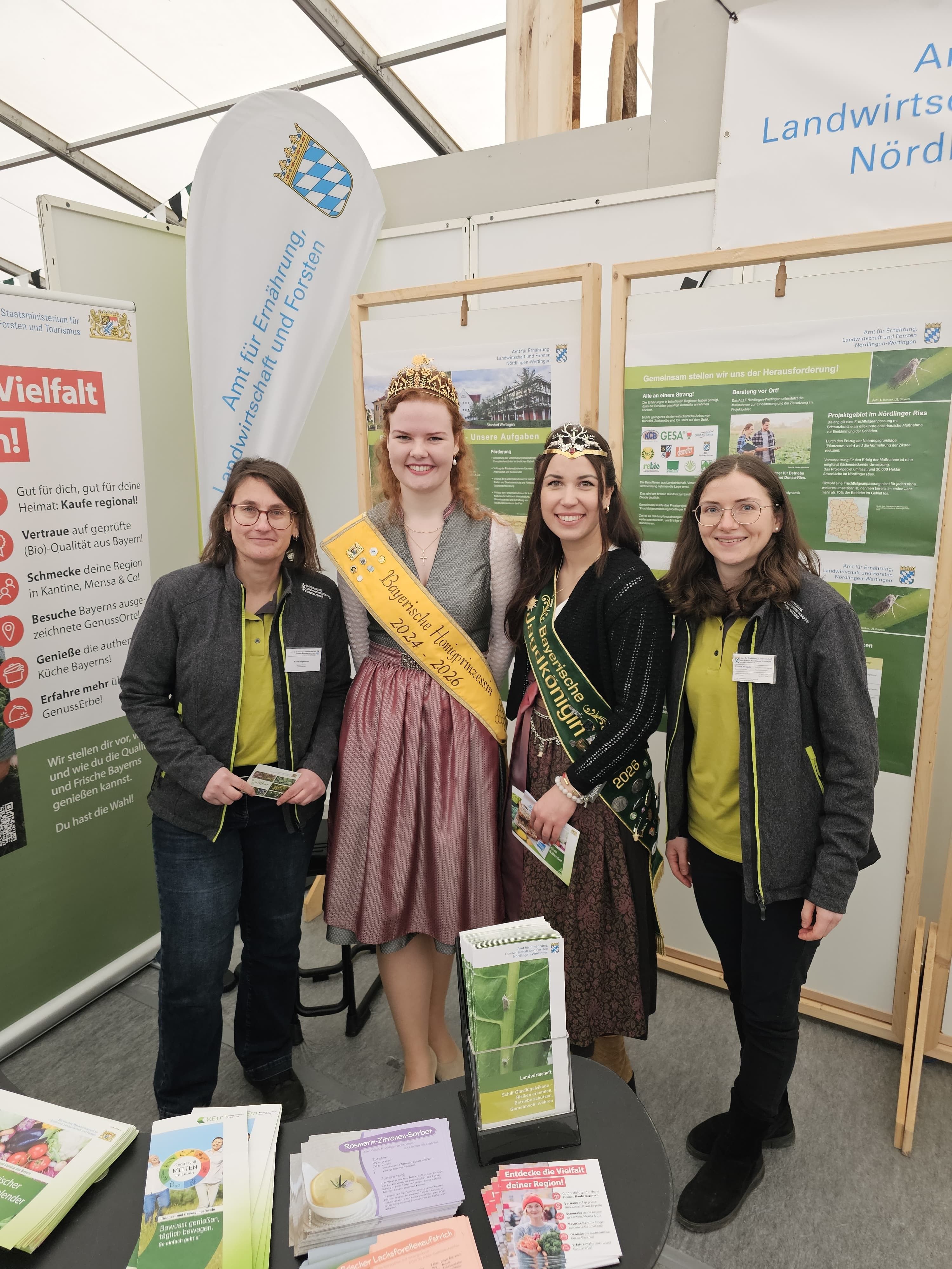 Am Stand der LWG durften die Bayerischen Honighoheiten auch den neuen Präsident Dr. Jörg Hirsche kennenlernen - den Schwerpunkt Wein vertraten dort jedoch die Fränkische Weinkönigin Antonia Kraiß (m.) sowie die Weinprinzessinnen Antonia Müller aus Tauberrettersheim und Angelina Jaques aus Albertshofen (r.), die sich gemeinsam mit der Fränkischen Kirschenkönigin, der Forchheimer Bierkönigin und den Bayerischen Honighoheiten zum Foto aufstellten.