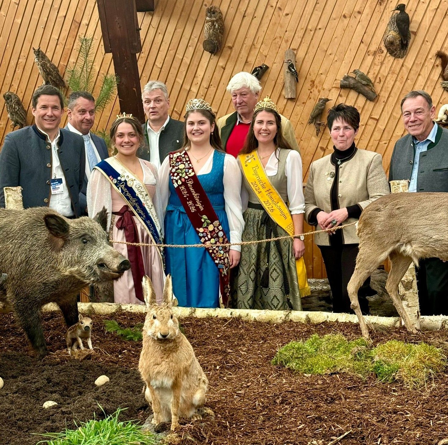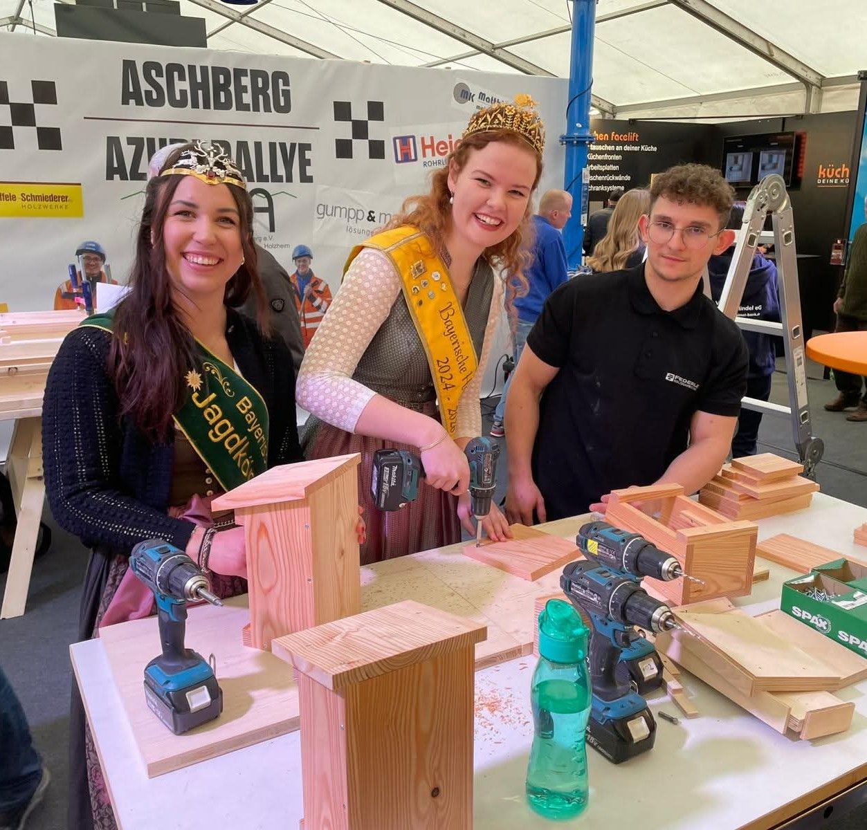 Die Bayerische Honigprinzessin Anja Bürzer besuchte beim Eröffnungsrundgang zusammen mit der Bayerischen Jagdkönigin Diana Merkle den Stand der Schreinerei Federle, wo sie selbst einen Nistkasten bauten (oben), sowie den Stand des Amtes für Ernährung, Landwirtschaft und Forsten (rechts), wo sie vom Team ebenfalls herzlich willkommen geheißen wurden.