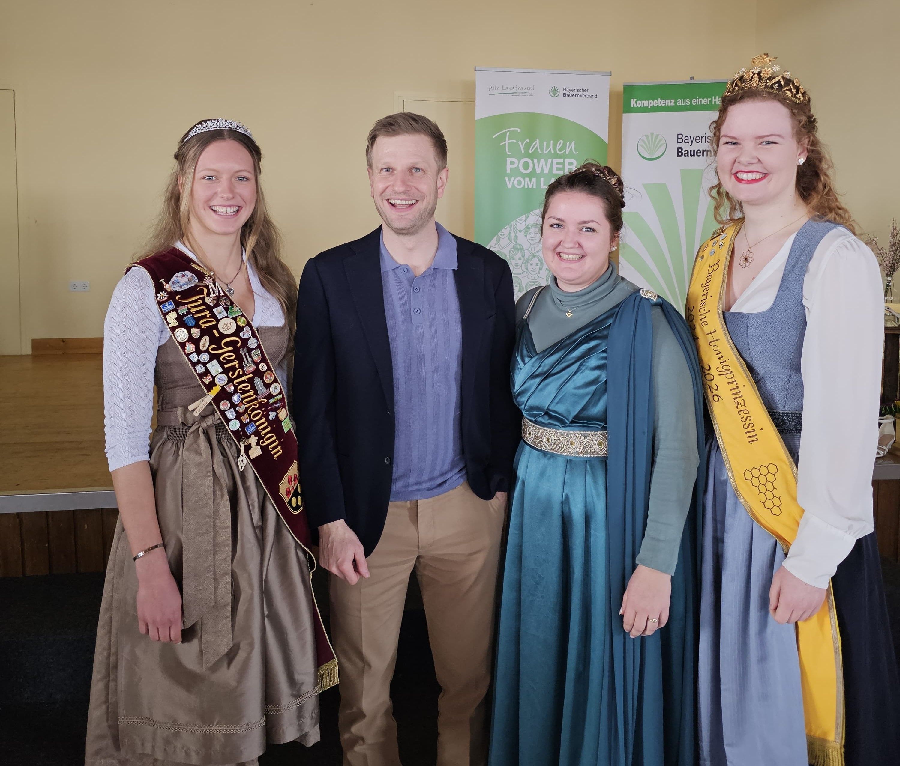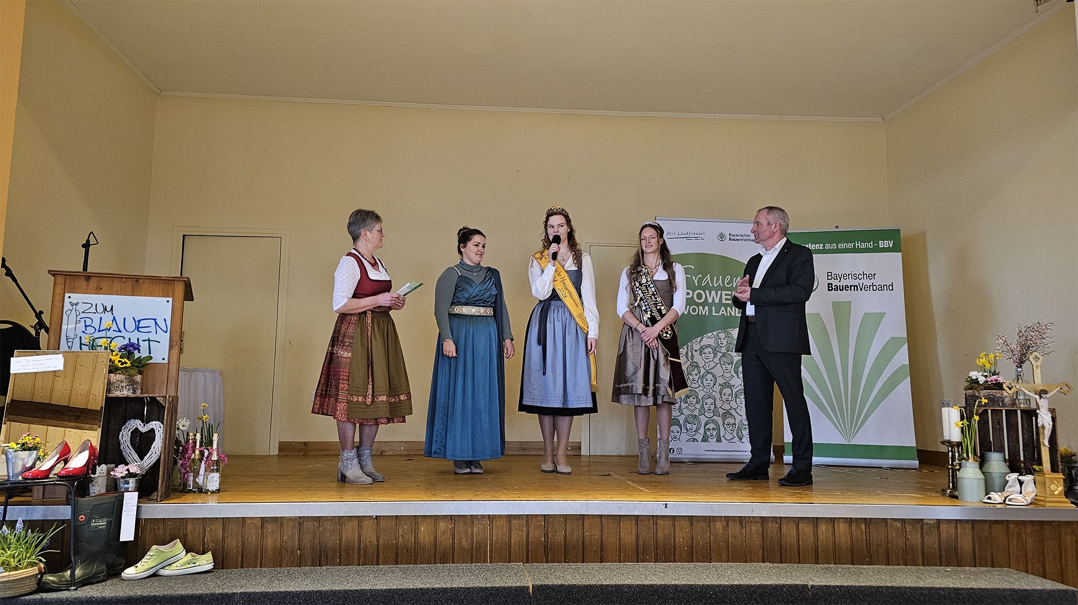 Zum moderierten Grußwort bat die stv. Kreisbäuerin Irmgard Pfaller neben der Limeskönigin Bernadette, der Bayerischen Honigprinzessin Anja und der Jura-Gerstenkönigin Marina auch Kreisobmann Johannes Scharl (v.l.n.r.).