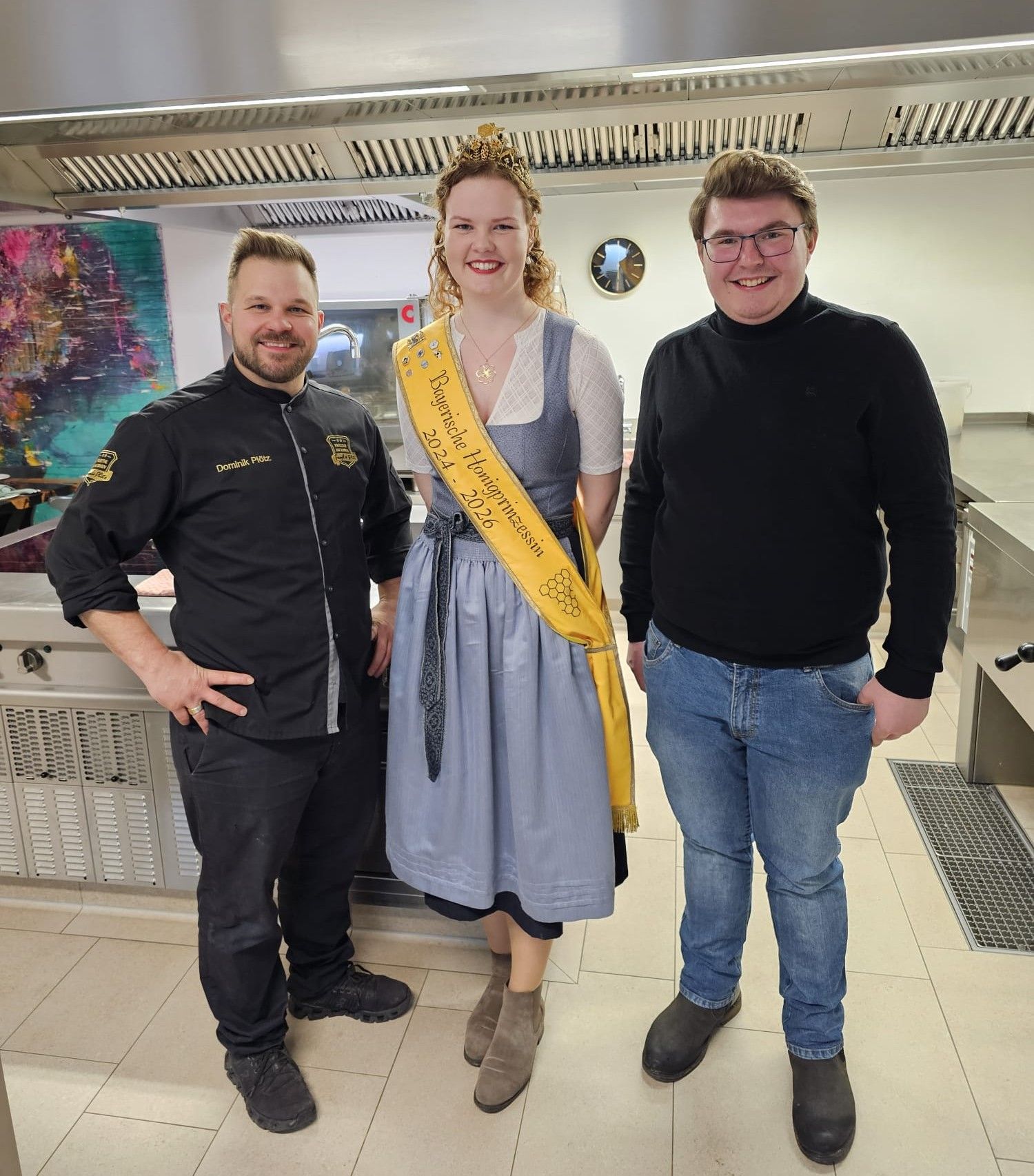 Koch Dominik Plötz, die Bayerische Honigprinzessin Anja Bürzer und Schriftführer Maxi Zinkl vom Imkerverein Egglkofen (v.l.) erwarten in der Küche des Gutshofes Schloss Egglkofen die anderen Teilnehmer des Kochabends.